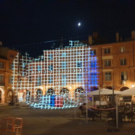 Projection de mires en préalable des essais et validation des prototypes de modification des lanternes de style existantes. Proche du solstice et pendant un match de foot ! Y’a de l’ambiance pendant les réglages 🙂