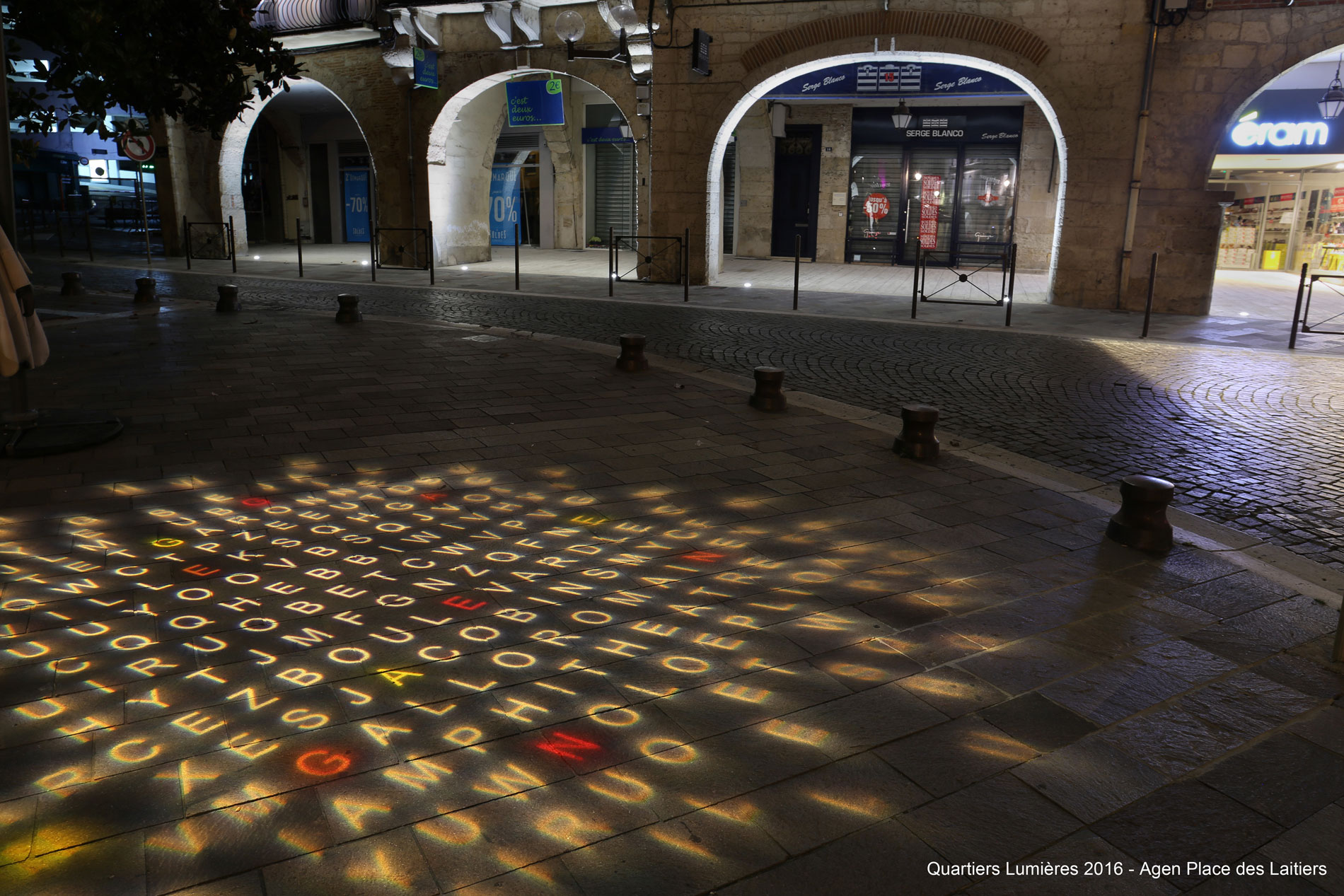 Les espaces au sols ont été totalement libérés et dans la continuité du boulevard de la République «Les mots cachés» ouvrent l’ambiance nocturne à l’imagination et à l’appropriation des lieux. Des projections graphiques au sol répondent aux éclairages de mise en valeur des façades animées d’une légère danse en tonalités de blancs.
