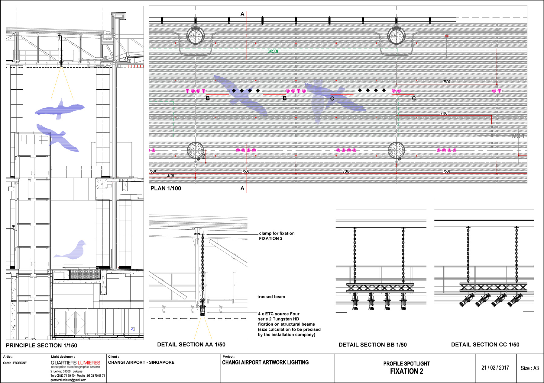 La mise en lumière de cette œuvre fut un véritable challenge : intégration dans un contexte aéroportuaire, mise en lumière H24 face à une immense ouverture vitrée… Les oiseaux volants ont été éclairés par des projecteurs ETC Source 4 intégrés dans la galerie technique du plafond et l’oiseau posé par des projecteurs ERCO dissimulés dans la végétation. Un challenge réussi pour une mise en lumière en blancs dynamiques.
