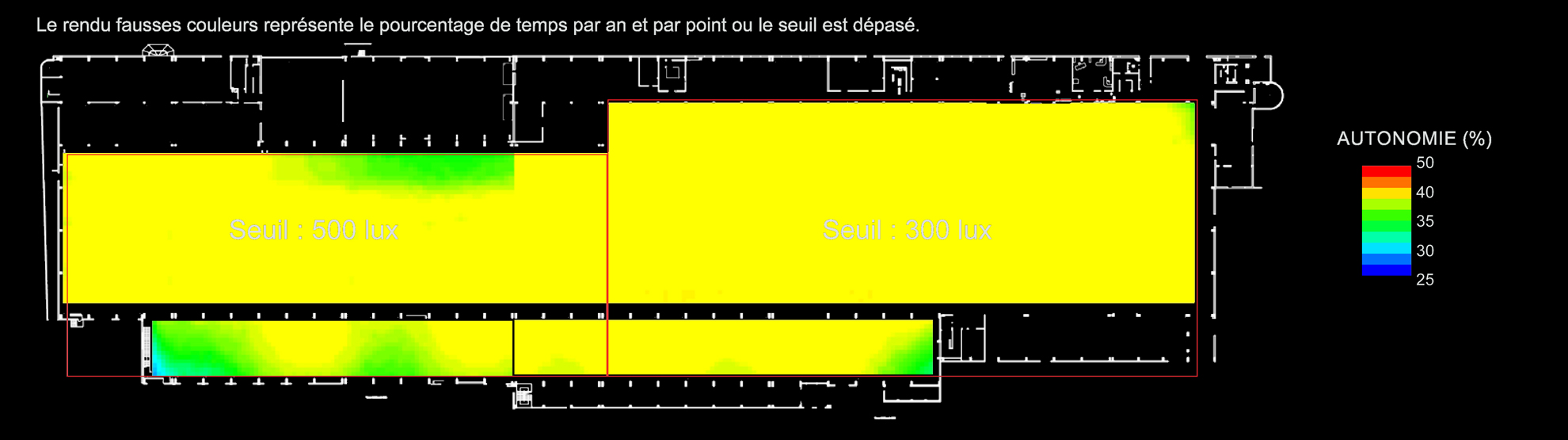 Dans certains cas, des calculs en autonomie en lumière du jour peuvent être réalisés afin de justifier ou non une régulation en fonction de l’éclairage naturel.