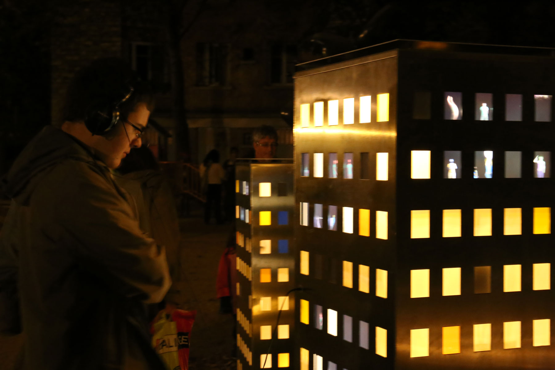 «Eux, les autres» propose un extrait d’espace urbain exposant des personnages enfermés dans trois tours d’immeubles. Les fenêtres identiques des trois tours invitent le passant à devenir un voyeur déambulant entre ces immeubles sans entrées ni sorties. Le public devient alors témoin de la vie de ces petits  habitants, clones colorés, dansant et errant d’une fenêtre à l’autre mais aussi spectateur de la vie de ces tours animées d’ambiances lumineuses et sonores. Le visiteur, géant voyeur au milieu de ces tours sonderait avec un casque les tranches de vies sonores capturées auprès des citadins.