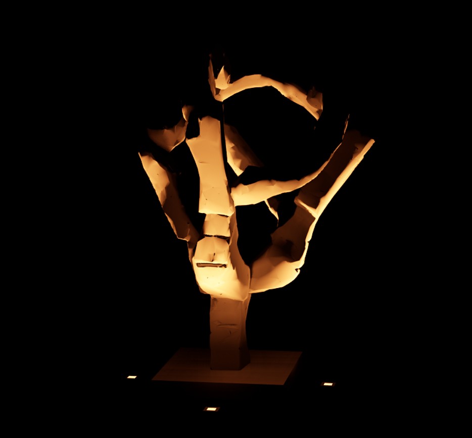 La principale spécificité de cette mise en lumière aura été un délai particulièrement court entre la demande et l’inauguration de l’œuvre. Pour accompagner la vision de l’artiste, quatre petits encastrés en blanc chaud viennent souligner les courbes et la texture du bronze. Une modélisation de cette mise en lumière a permis d’éprouver les effets créés.