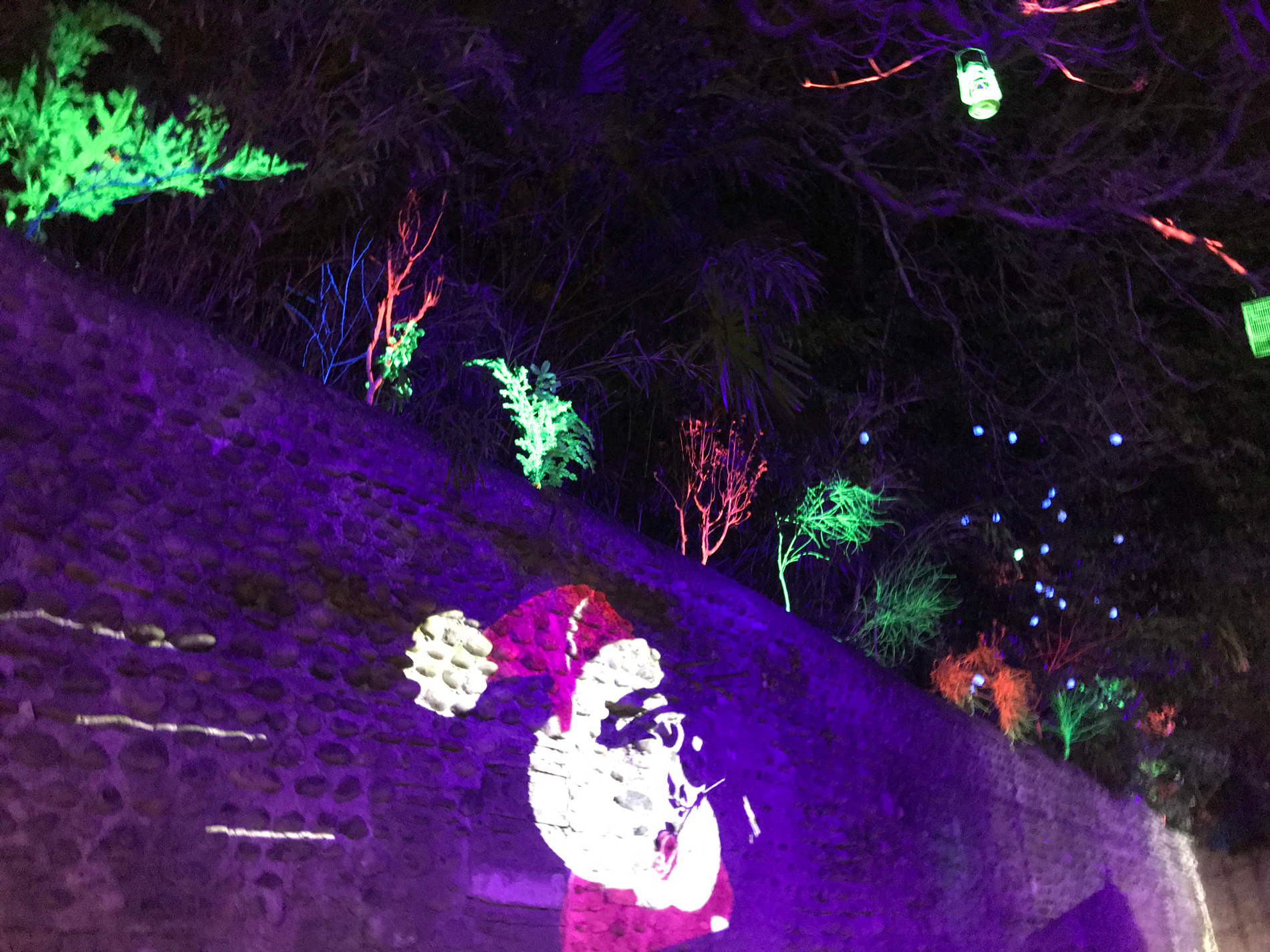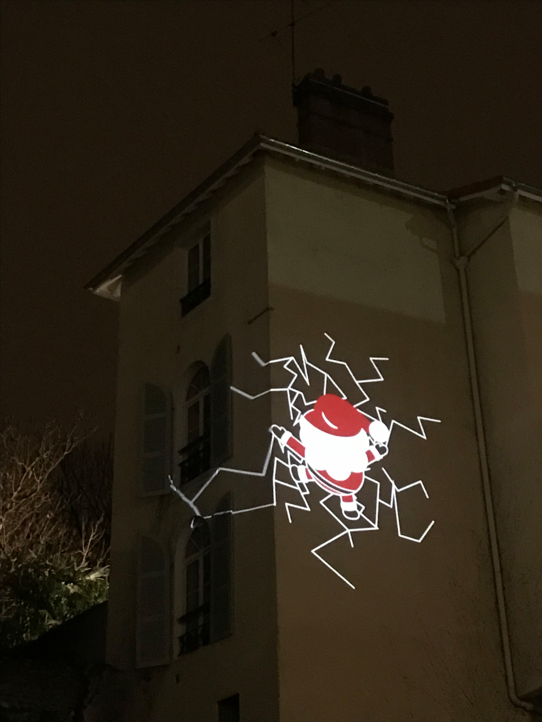 L’ambiance quotidienne du quartier a été modifiée. L’ajout de petits projecteurs laser habillent les arbres de lucioles. Des petits projecteurs ultraviolet révèlent une nouvelle végétation fluorescente et phosphorescente ajoutée d’un pays imaginaire. La magie de noël mélangée au Street Art Lighting du quartier.