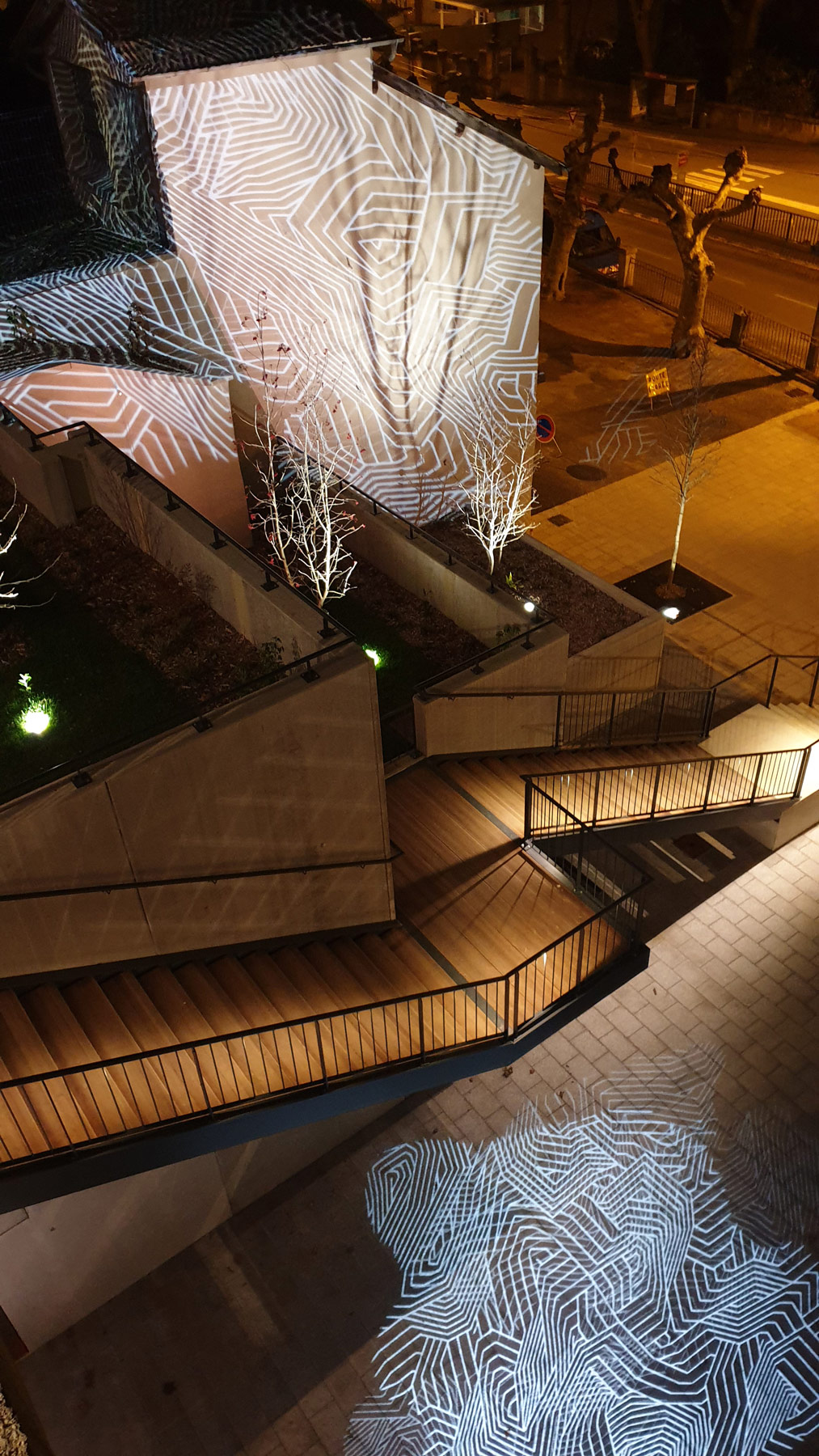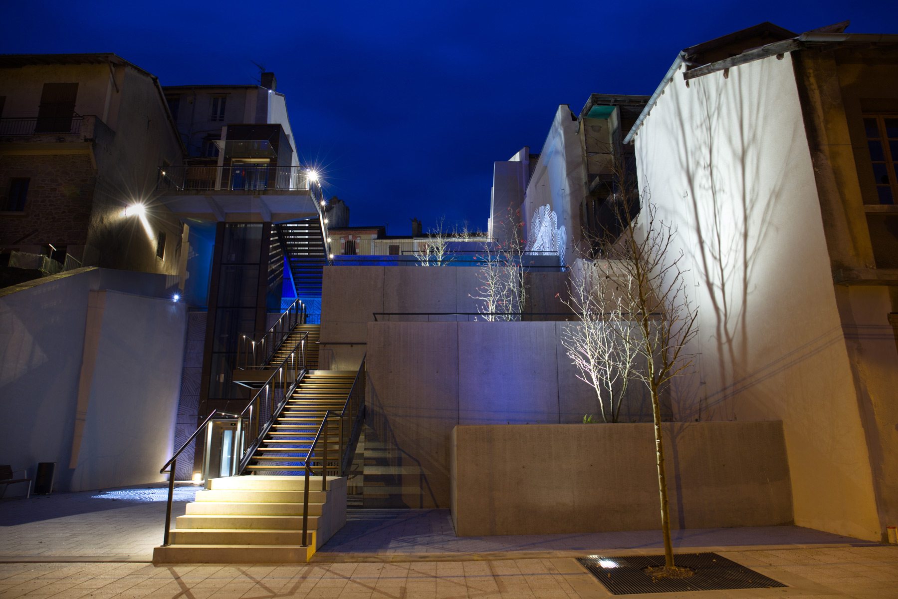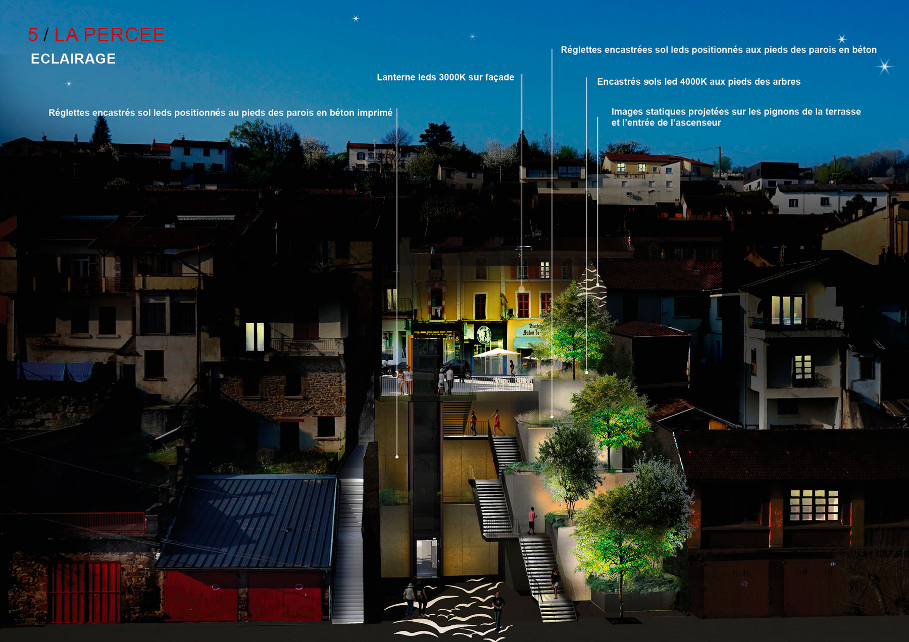 La rue Cayrade et la terrasse supérieure de la percée sont éclairées par des lanternes sur façade modernes et sobres, équipées de sources LEDs émettant une lumière blanche chaude 3000K. La percée urbaine crée à la fois l’animation tout en apportant un confort nocturne. L’éclairage quotidien en nuances de blancs varie selon les festivités en lumières colorées sur les murs des terrasses. Des projections d’images sur les murs pignons et les sorties d’ascenseurs viennent interpeller tout en offrant une ambiance dynamique.