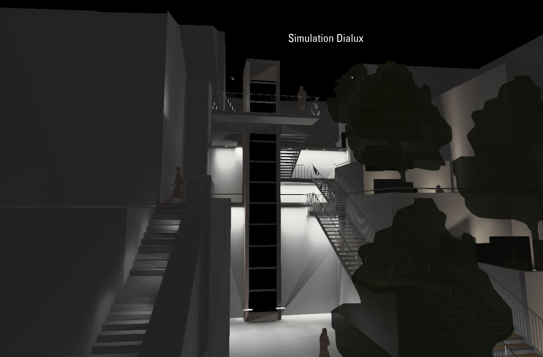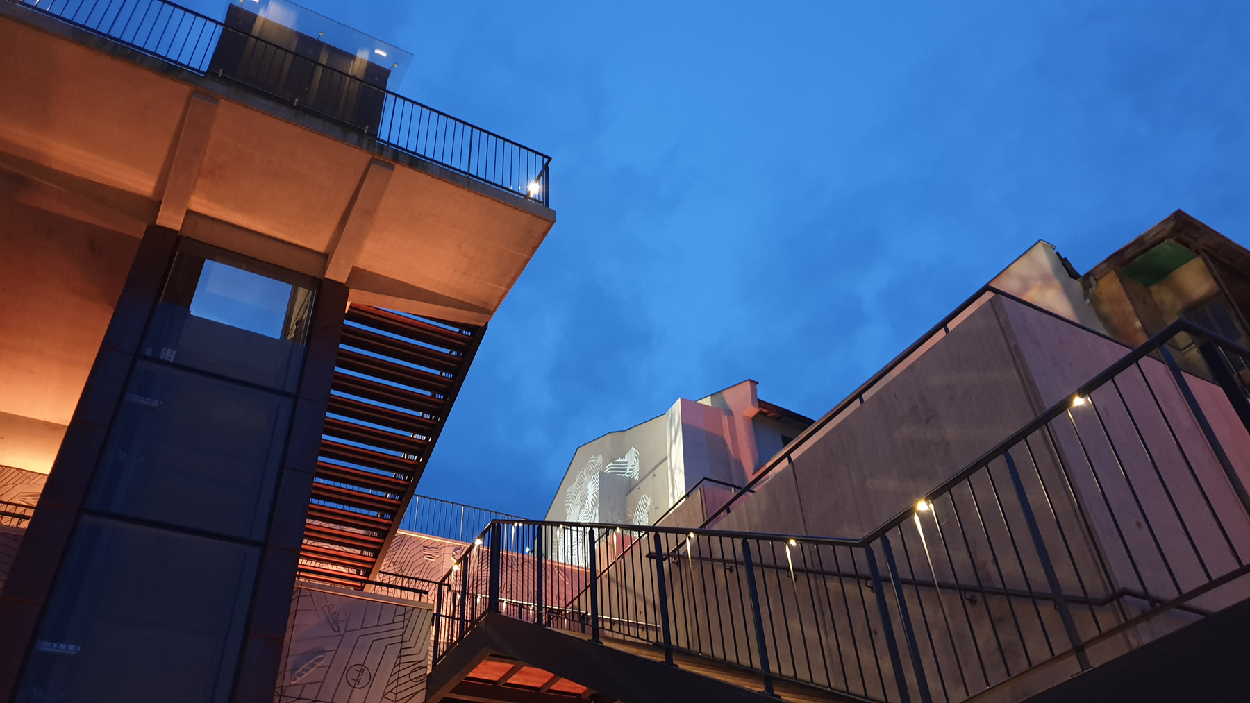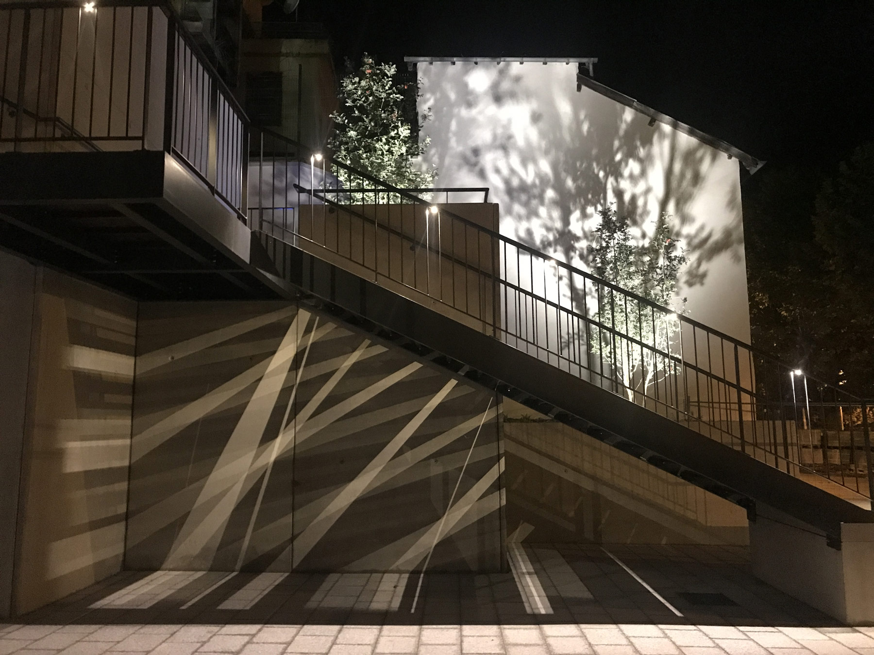 La rue Cayrade et la terrasse supérieure de la percée sont éclairées par des lanternes sur façade modernes et sobres, équipées de sources LEDs émettant une lumière blanche chaude 3000K. La percée urbaine crée à la fois l’animation tout en apportant un confort nocturne. L’éclairage quotidien en nuances de blancs varie selon les festivités en lumières colorées sur les murs des terrasses. Des projections d’images sur les murs pignons et les sorties d’ascenseurs viennent interpeller tout en offrant une ambiance dynamique.