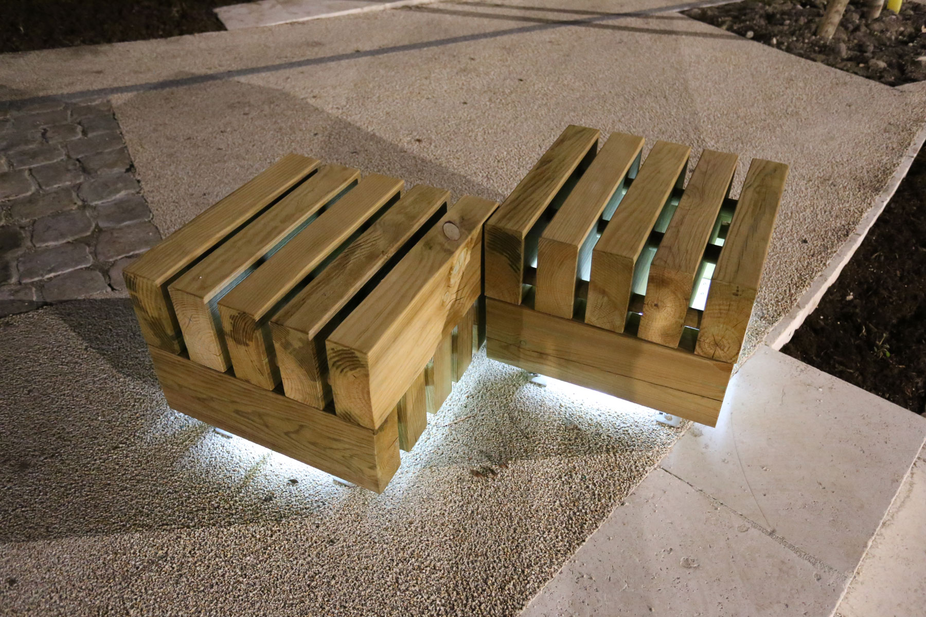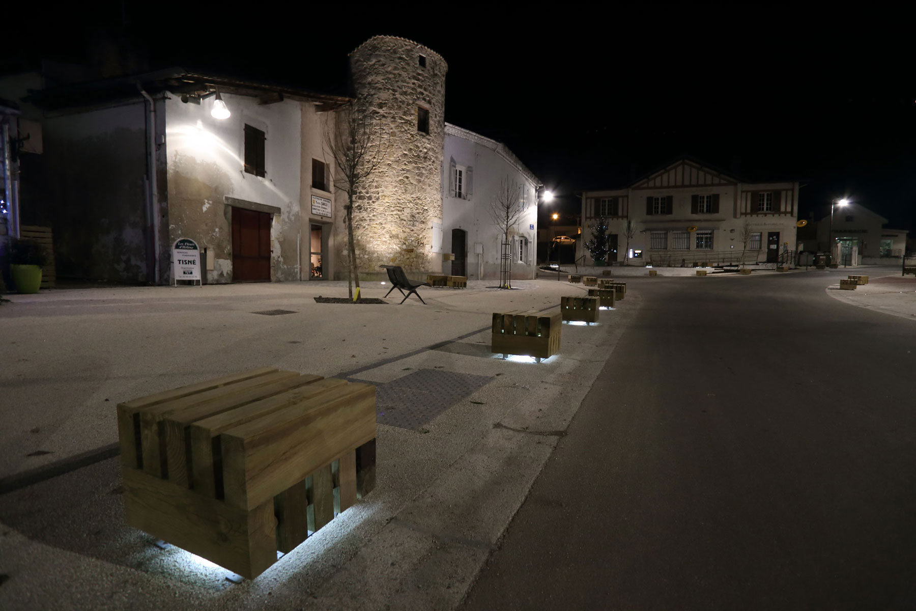 Le mobilier d’éclairage est cristallin, reflet du sous-sol géologique particulier du site. Les bancs en bois spécialement dessinés par l’Agence Casals sont éclairés de l’intérieur par des sources leds. La tour, identité historique de la place, est soulignée par une lumière blanche 3000K.